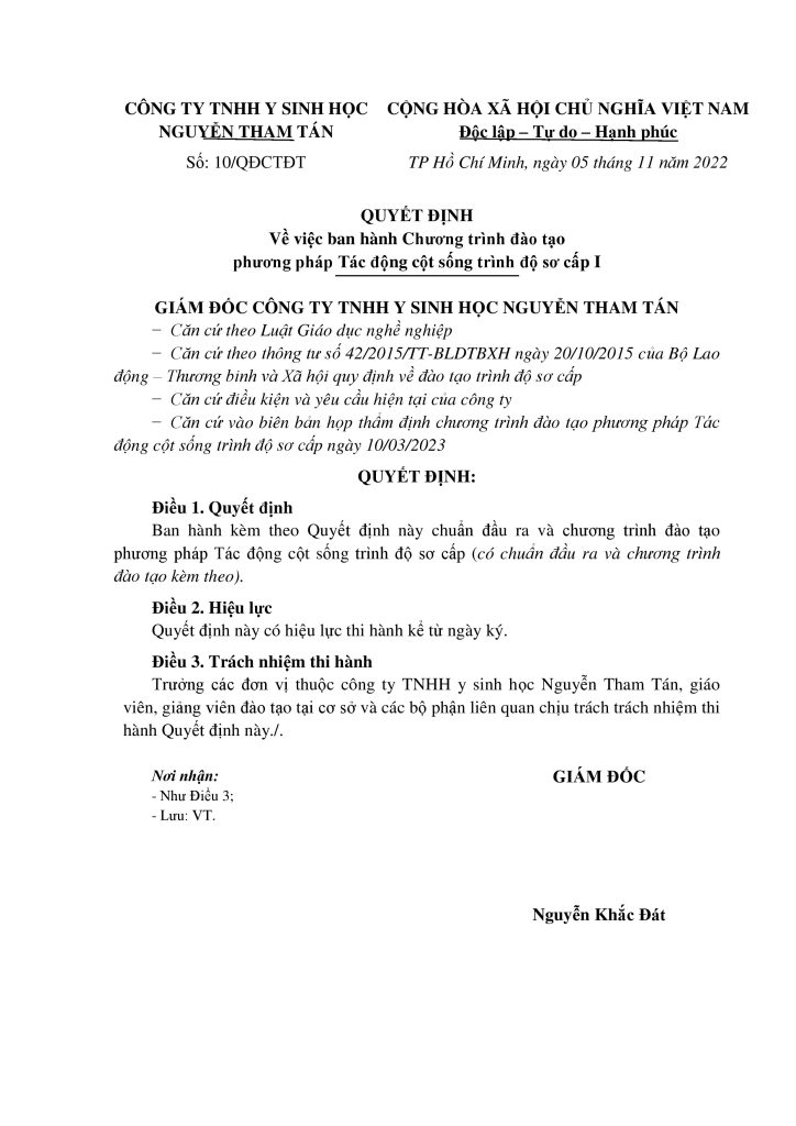 6. Chứng chỉ đào tạo: Sau khi kết thúc khóa học, học viên sẽ được cấp Chứng chỉ đào tạo tác động cột sống trình độ sơ cấp