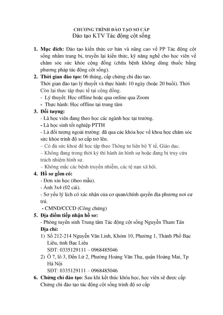 1. Mục đích: Đào tạo kiến thức cơ bản và nâng cao về PP Tác động cột sống nhằm trang bị, truyền lại kiến thức, kỹ năng nghề cho học viên về chăm sóc sức khỏe cộng đồng (chữa bệnh không dùng thuốc bằng phương pháp tác động cột sống).