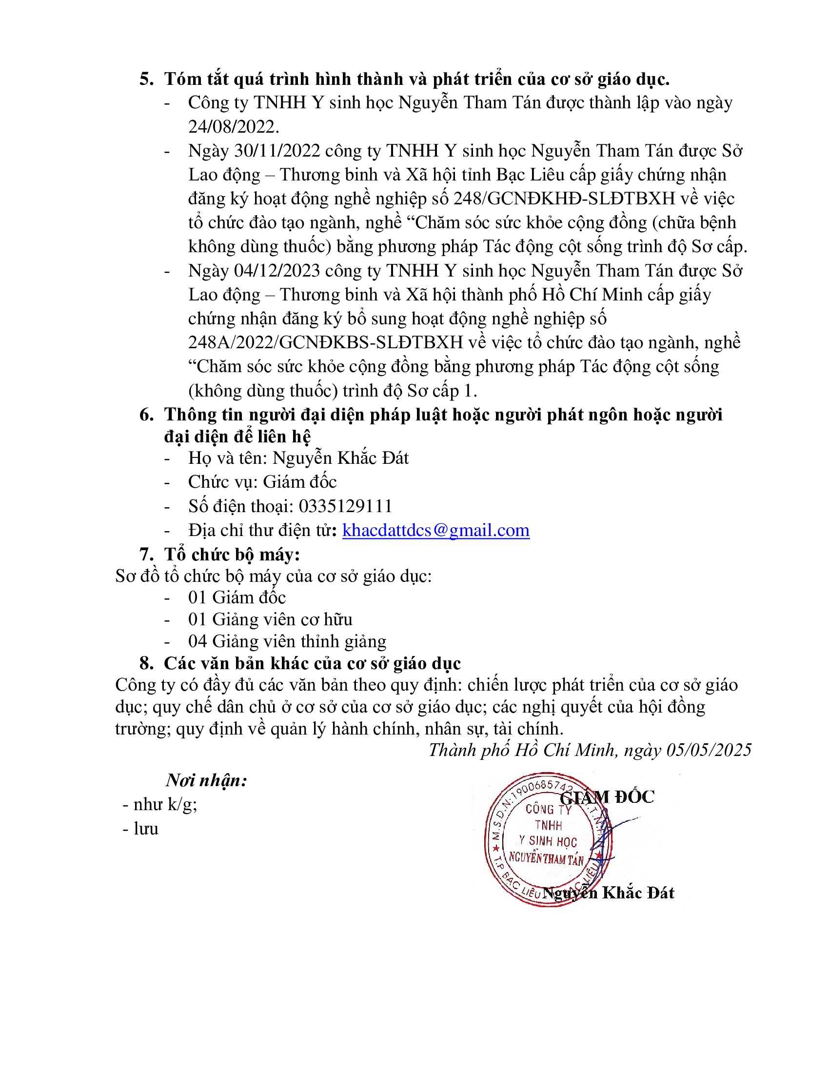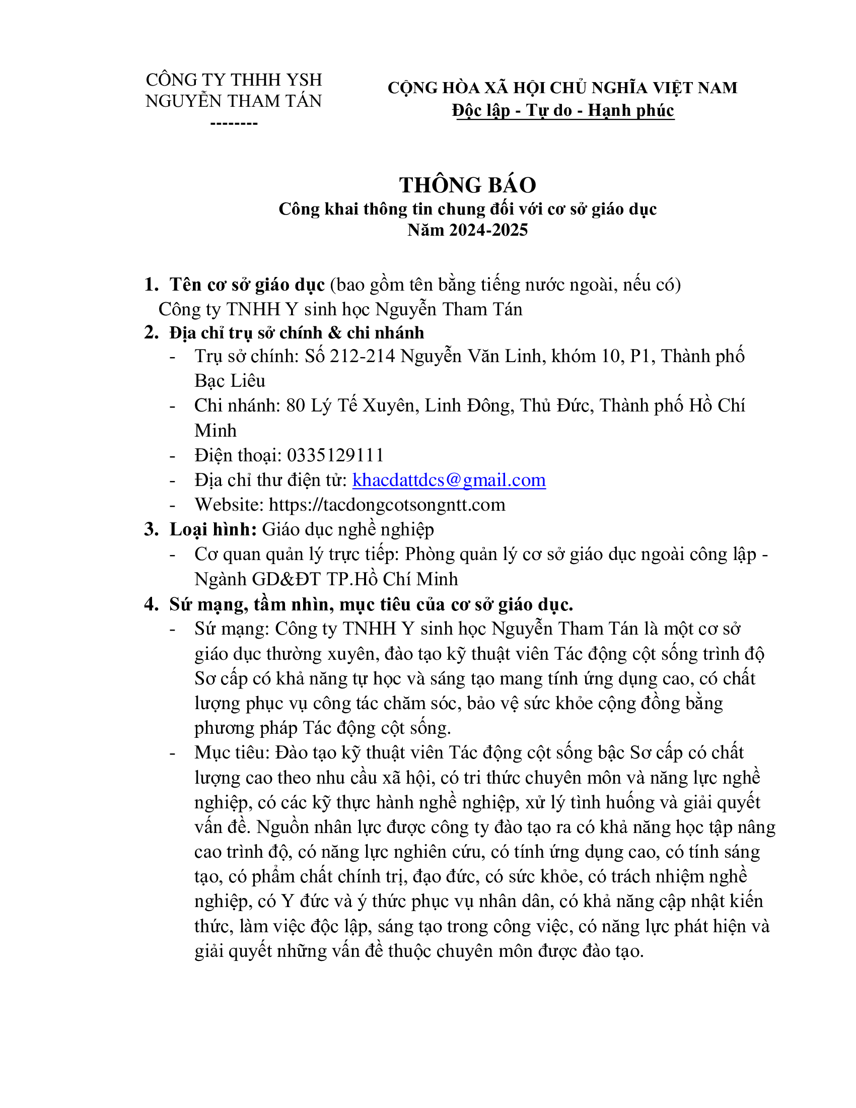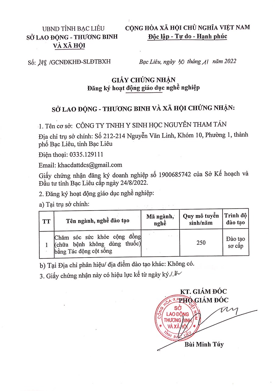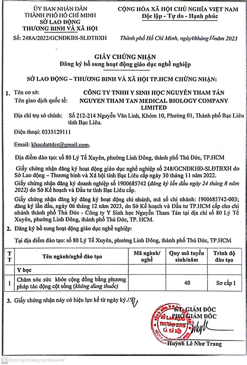 Đồng thời Trung tâm tác động cột sống Nguyễn Tham Tán đã được Sở Lao động – Thương binh và Xã hội Bạc Liêu cấp Giấy chứng nhận đăng ký hoạt động Giáo dục nghề nghiệp (số 248/GCNĐKHĐ-SLĐTBXH ngày 30/11/2022) với ngành nghề đào tạo: Chăm sóc sức khỏe cộng đồng (Chữa bệnh không dùng thuốc bằng tác động cột sống).